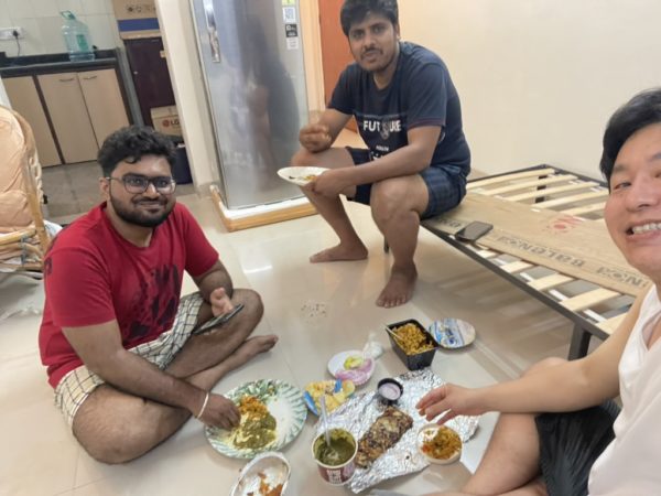 帰宅後は、ビリヤニとピザをみんなでシェアしながらクリケット観戦。