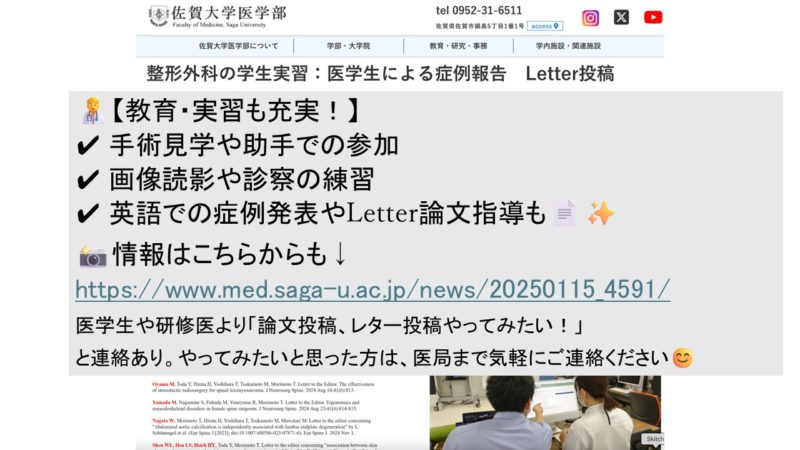 最近では、5年生の病棟実習中に、Letter論文や症例報告の指導を希望する学生も増えており、随時対応しています。希望する方は整形外科医局までお気軽にご連絡ください。
