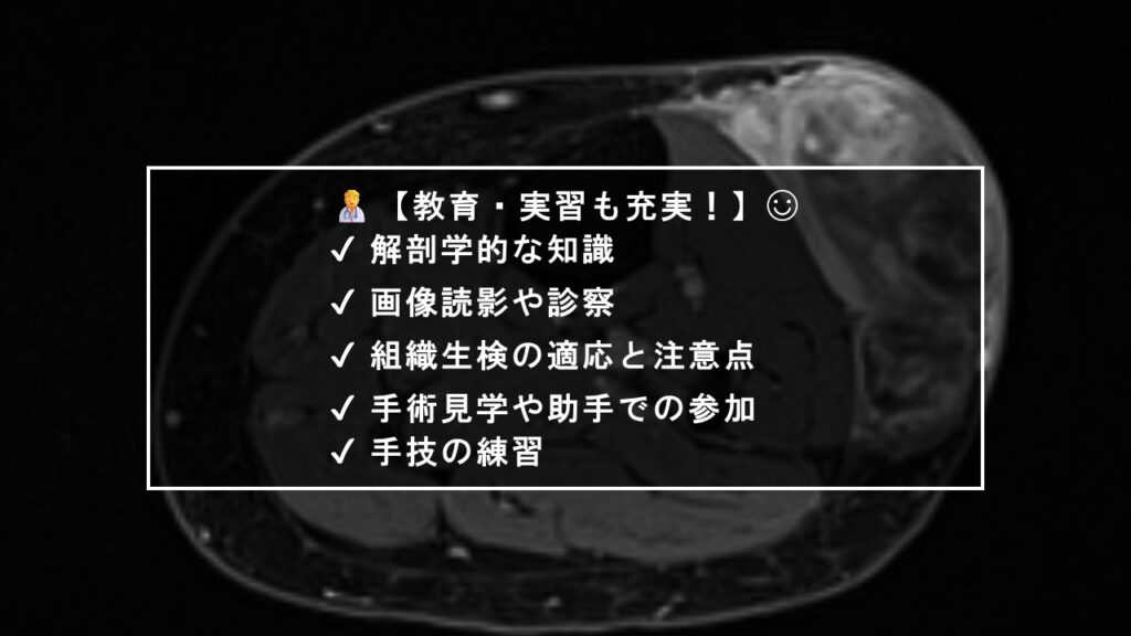 骨軟部腫瘍班では、希少疾患を扱うからこそ、診断プロセスのロジック手術計画の立て方を丁寧に解説し、学生・研修医が理解しやすい教育を重視しています。