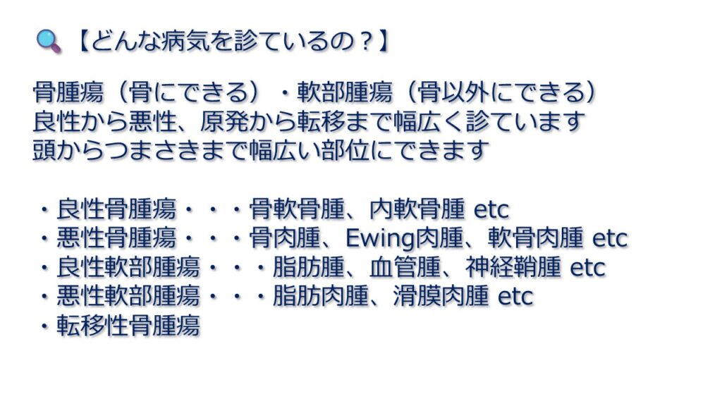 骨軟部腫瘍領域は、整形外科の中でも最も専門性の高い分野のひとつであり、骨・軟部組織に発生する良性腫瘍から悪性腫瘍(肉腫)、転移性骨腫瘍まで幅広く診療しています
