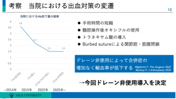 思えば当班では、2010年代からトラネキサム酸の投与経路(静注 vs 局所)についての研究を行うなど、一貫して「安全かつ効率的な出血管理」を追求してきました 。今回のドレーン非使用への移行も、こうした過去のエビデンスの積み重ねがあったからこそ自信を持って踏み出せた一歩です 。