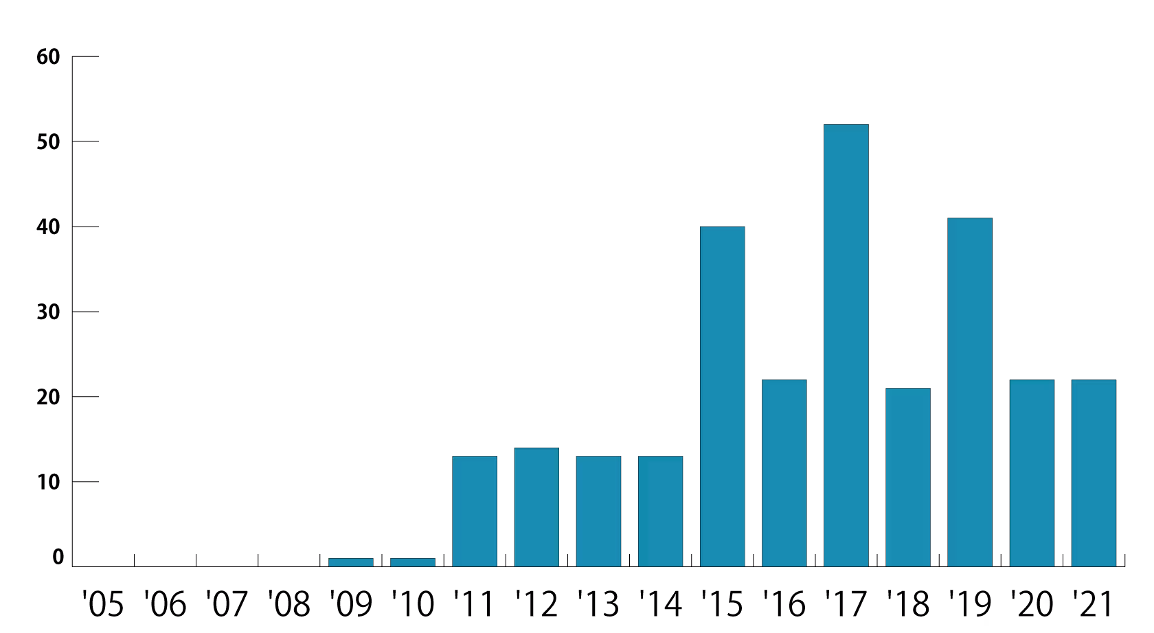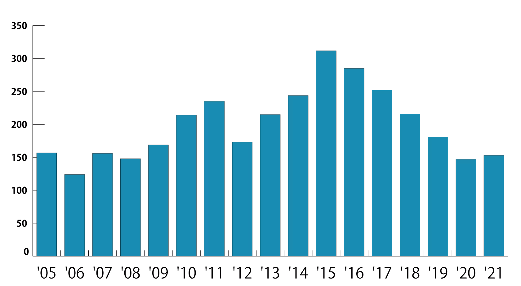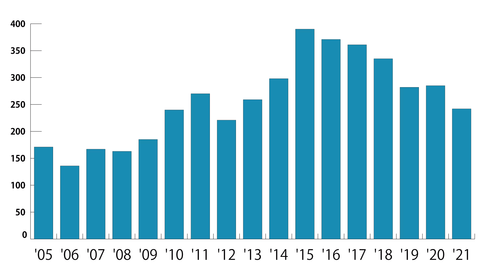 コロナ禍の影響もありやや手術件数は減少しておりますが、個々人の膝の変形の程度、特徴をよく考慮し、人工膝関節や膝関節周囲骨切り術の最適な手術法を選択するよう努めております。